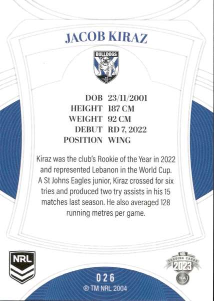 2023 NRL Elite Common Card - 026 - Jacob Kiraz - Canterbury-Bankstown Bulldogs