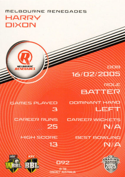 2025-26 Cricket Traders - Common - 092 - Harry Dixon - Melbourne Renegades