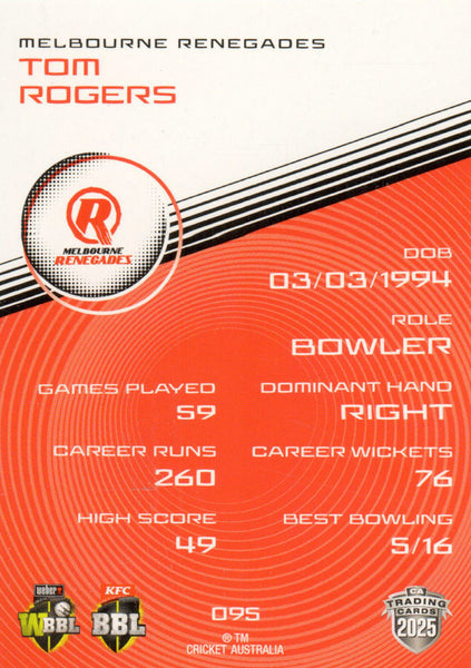 2025-26 Cricket Traders - Common - 095 - Tom Rogers - Melbourne Renegades