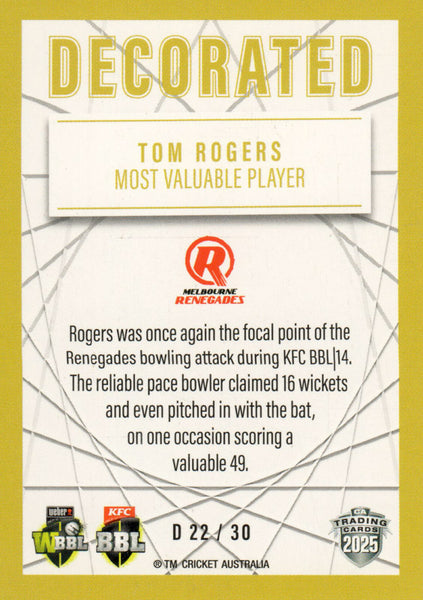 2025-26 Cricket Traders - Decorated - D 22 - Tom Rogers - Melbourne Renegades