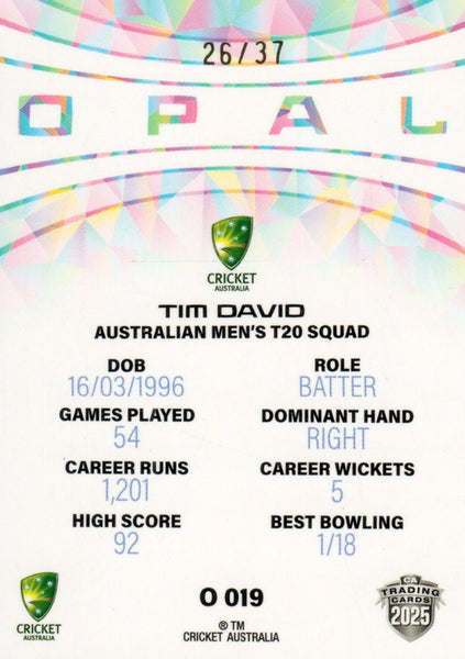 2025-26 Cricket Traders - Mojo Opal White - O 019 - Tim David - 26/37