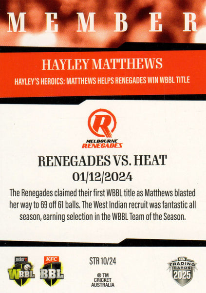 2025-26 Cricket Traders - Season To Remember - STR 10 - Hayley Matthews - Melbourne Renegades