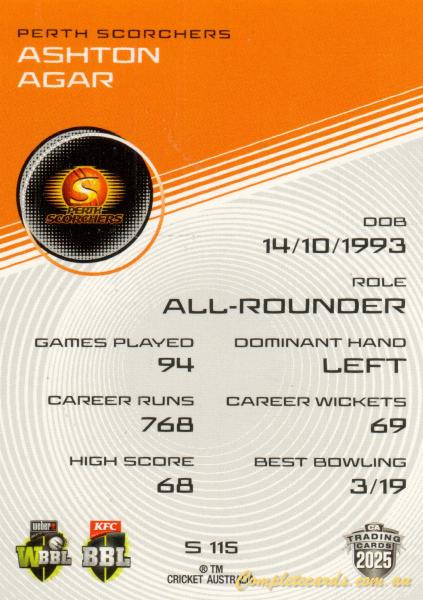 2025-26 Cricket Traders - Silver - S 115 - Ashton Agar - Perth Scorchers