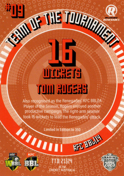 2025-26 Cricket Traders - Team Of The Tournament Bronze - TTB 21 - Tom Rogers - Melbourne Renegades